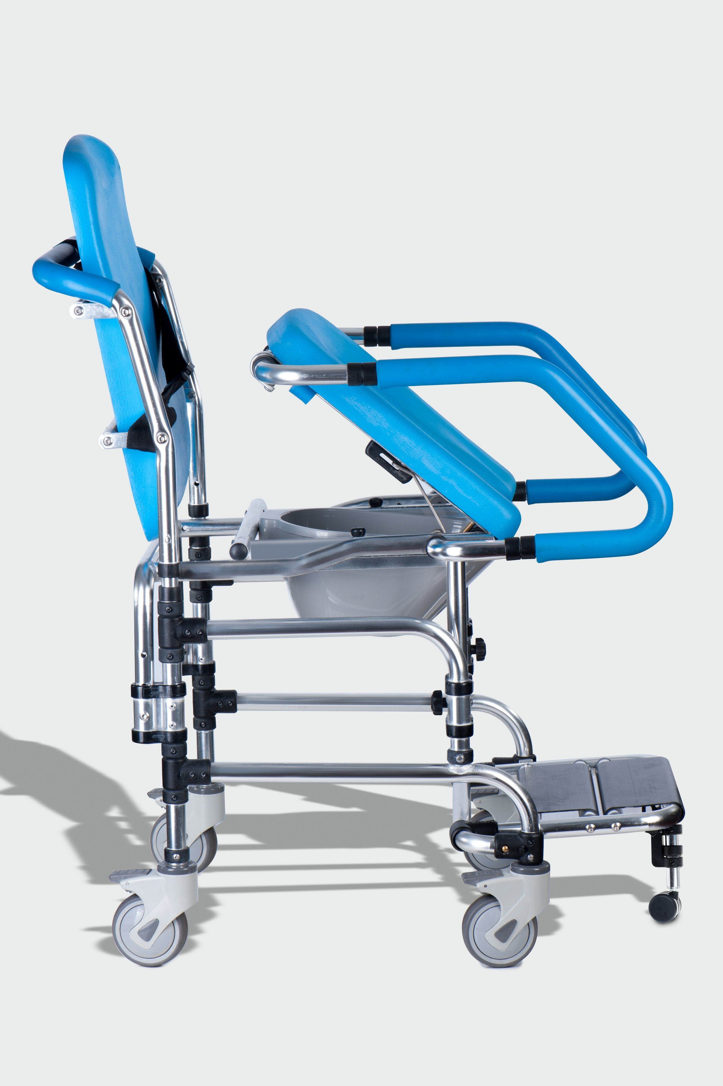 El diseño impermeable del COMMODE es ideal para usar en la ducha y los cubos intercambiables incluidos se pueden quitar para limpiarlos y usarlos sobre el inodoro. Además, sus apoyabrazos acolchados, su asiento densamente acolchado y su respaldo de altura ajustable brindan una comodidad superior.